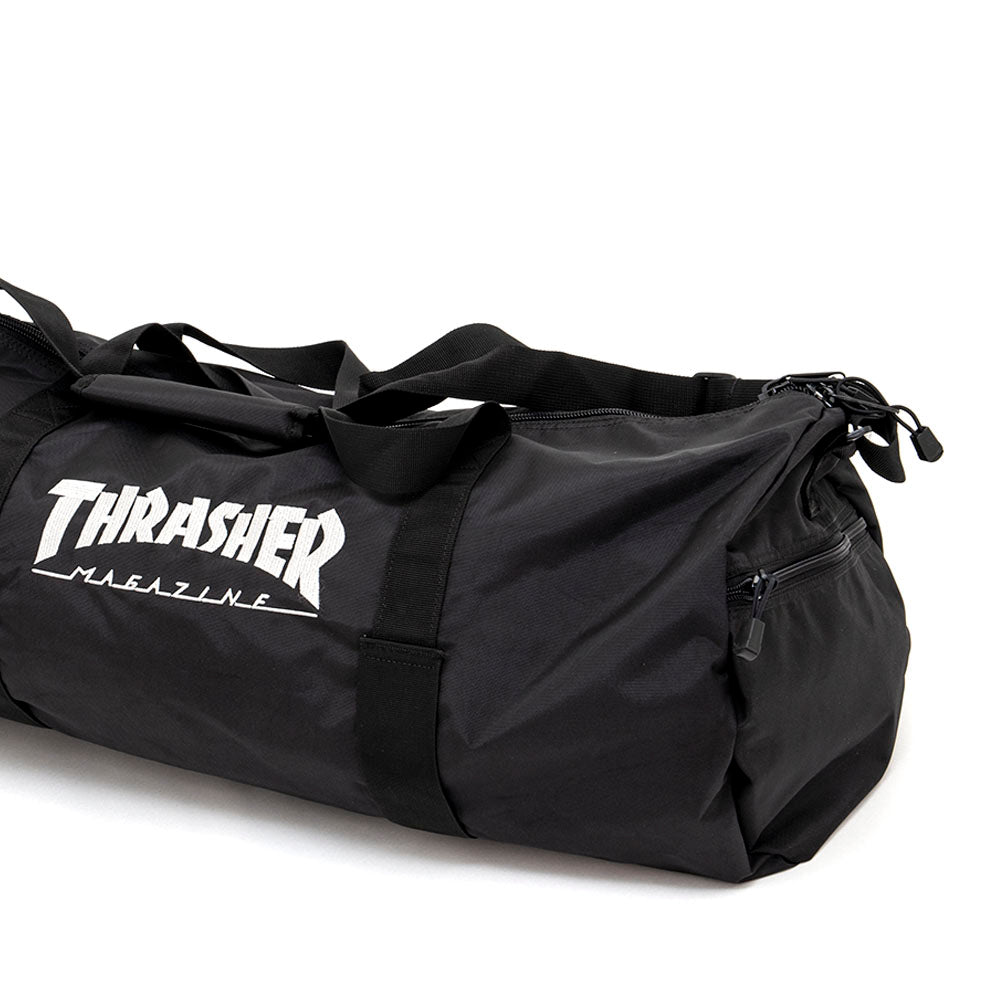 Large heavy-duty duffel bag with durable zipper. Fits skateboard inside or attach skateboard to outside with straps. Roomy end pockets with wet/dry compartment and "Thrasher Magazine" embroidered on the side. Also features an adjustable padded shoulder strap.